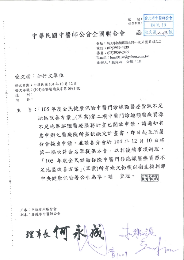 | 台北市中醫師公會 官網:http://www.tpcma.org.tw 地址:台北市中正區青島西路11號3樓 E-mail:tp.cma@msa.hinet.net 電話:(02)2314-3456(代表號) 傳真:(02)2314-8181 |