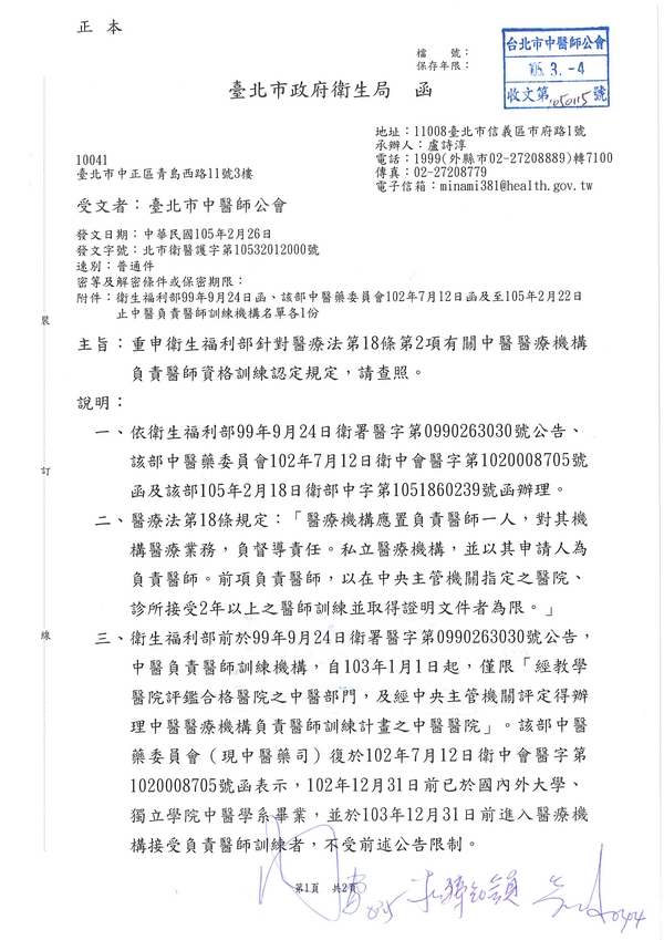 | 台北市中醫師公會 官網:http://www.tpcma.org.tw 地址:台北市中正區青島西路11號3樓 E-mail:tp.cma@msa.hinet.net 電話:(02)2314-3456(代表號) 傳真:(02)2314-8181 |