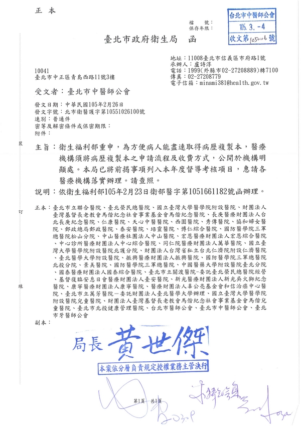 | 台北市中醫師公會 官網:http://www.tpcma.org.tw 地址:台北市中正區青島西路11號3樓 E-mail:tp.cma@msa.hinet.net 電話:(02)2314-3456(代表號) 傳真:(02)2314-8181 |