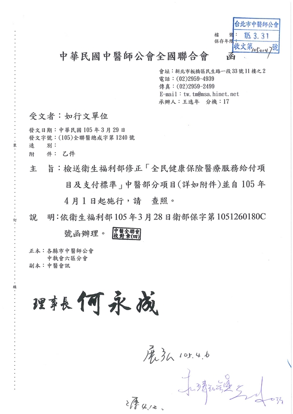 | 台北市中醫師公會 官網:http://www.tpcma.org.tw 地址:台北市中正區青島西路11號3樓 E-mail:tp.cma@msa.hinet.net 電話:(02)2314-3456(代表號) 傳真:(02)2314-8181 |