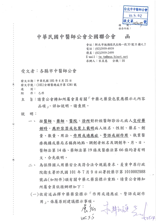 | 台北市中醫師公會 官網:http://www.tpcma.org.tw 地址:台北市中正區青島西路11號3樓 E-mail:tp.cma@msa.hinet.net 電話:(02)2314-3456(代表號) 傳真:(02)2314-8181 |