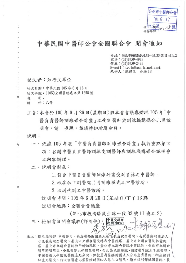 | 台北市中醫師公會 官網:http://www.tpcma.org.tw 地址:台北市中正區青島西路11號3樓 E-mail:tp.cma@msa.hinet.net 電話:(02)2314-3456(代表號) 傳真:(02)2314-8181 |