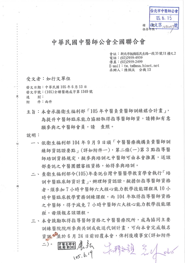 | 台北市中醫師公會 官網:http://www.tpcma.org.tw 地址:台北市中正區青島西路11號3樓 E-mail:tp.cma@msa.hinet.net 電話:(02)2314-3456(代表號) 傳真:(02)2314-8181 |