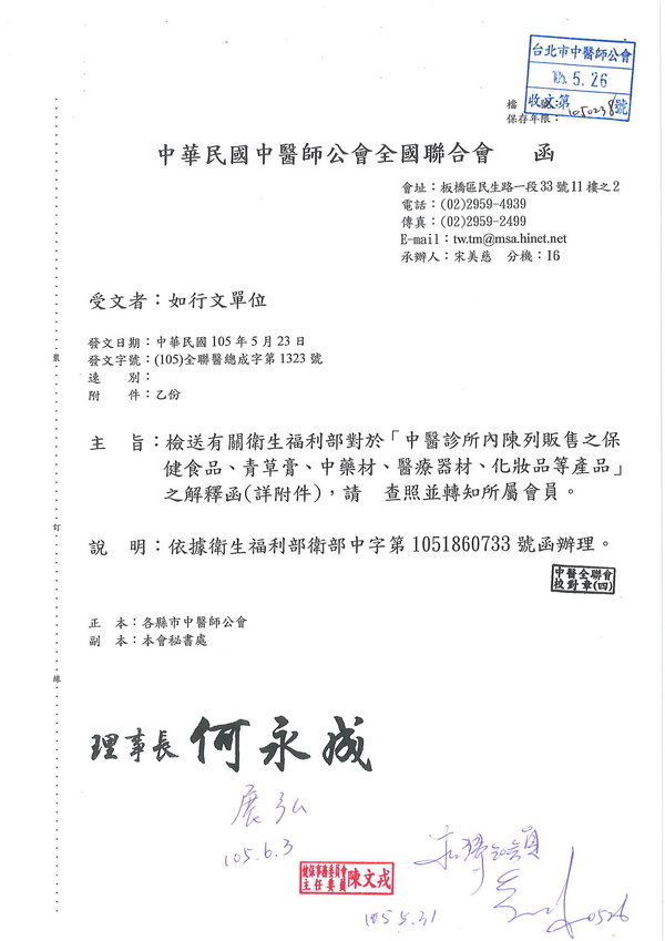 | 台北市中醫師公會 官網:http://www.tpcma.org.tw 地址:台北市中正區青島西路11號3樓 E-mail:tp.cma@msa.hinet.net 電話:(02)2314-3456(代表號) 傳真:(02)2314-8181 |