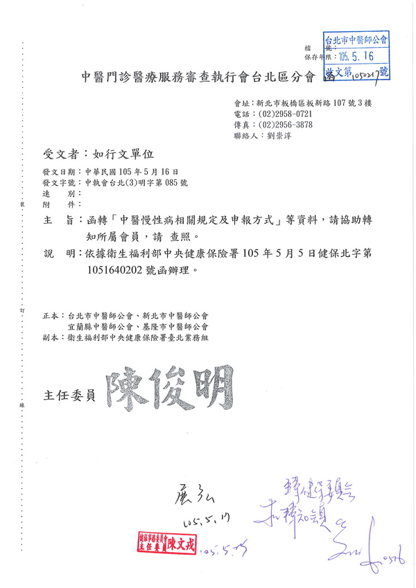| 台北市中醫師公會 官網:http://www.tpcma.org.tw 地址:台北市中正區青島西路11號3樓 E-mail:tp.cma@msa.hinet.net 電話:(02)2314-3456(代表號) 傳真:(02)2314-8181 |