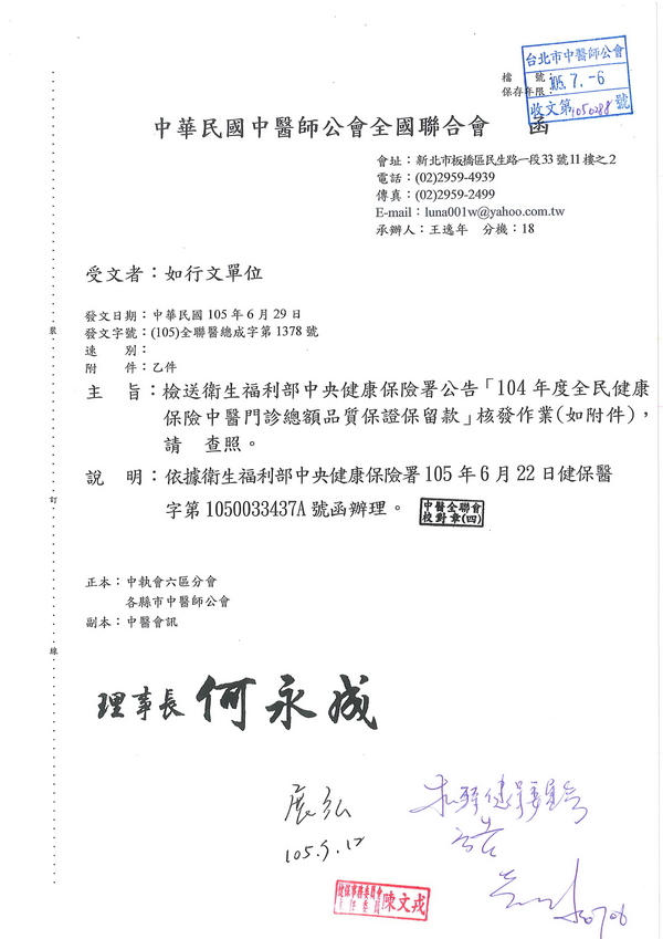 | 台北市中醫師公會 官網:http://www.tpcma.org.tw 地址:台北市中正區青島西路11號3樓 E-mail:tp.cma@msa.hinet.net 電話:(02)2314-3456(代表號) 傳真:(02)2314-8181 |
