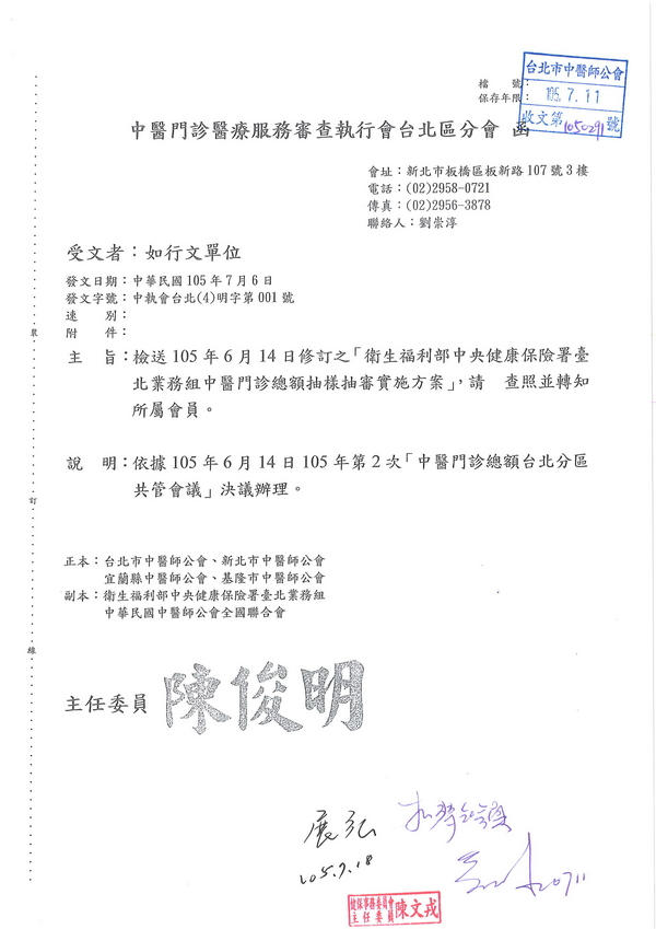 | 台北市中醫師公會 官網:http://www.tpcma.org.tw 地址:台北市中正區青島西路11號3樓 E-mail:tp.cma@msa.hinet.net 電話:(02)2314-3456(代表號) 傳真:(02)2314-8181 |