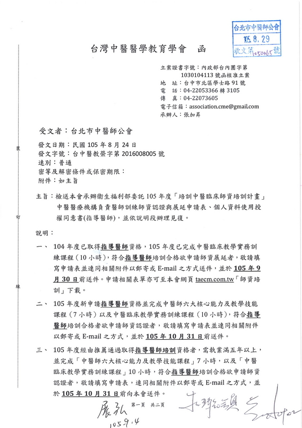 | 台北市中醫師公會 官網:http://www.tpcma.org.tw 地址:台北市中正區青島西路11號3樓 E-mail:tp.cma@msa.hinet.net 電話:(02)2314-3456(代表號) 傳真:(02)2314-8181 |