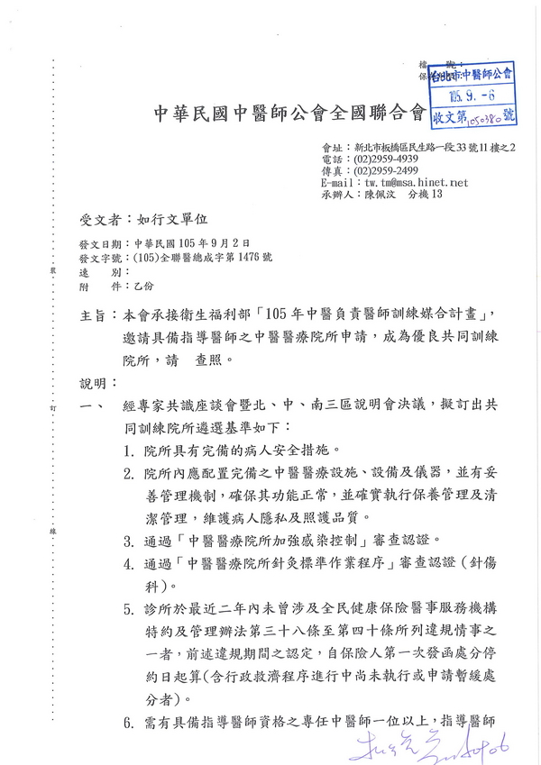 | 台北市中醫師公會 官網:http://www.tpcma.org.tw 地址:台北市中正區青島西路11號3樓 E-mail:tp.cma@msa.hinet.net 電話:(02)2314-3456(代表號) 傳真:(02)2314-8181 |