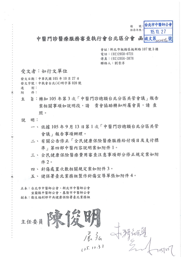 | 台北市中醫師公會 官網:http://www.tpcma.org.tw 地址:台北市中正區青島西路11號3樓 E-mail:tp.cma@msa.hinet.net 電話:(02)2314-3456(代表號) 傳真:(02)2314-8181 |