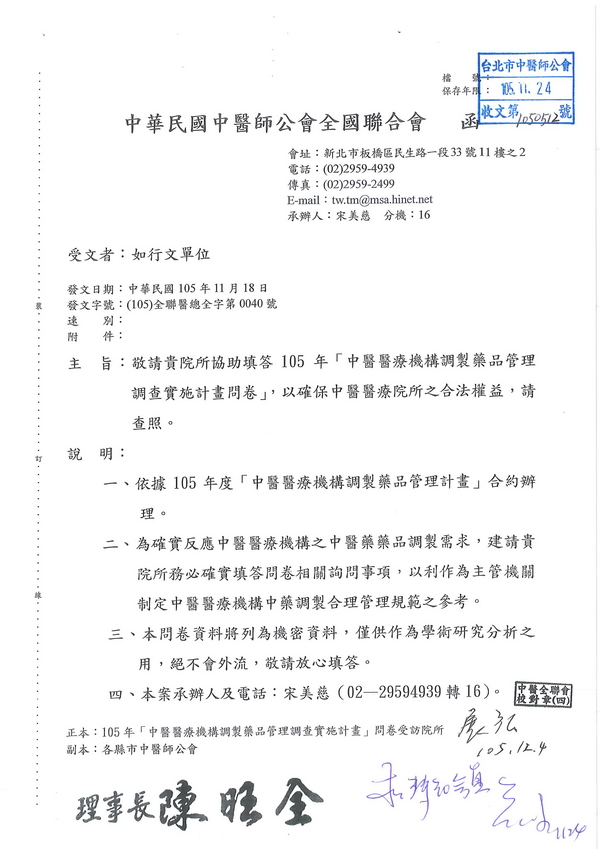 | 台北市中醫師公會 官網:http://www.tpcma.org.tw 地址:台北市中正區青島西路11號3樓 E-mail:tp.cma@msa.hinet.net 電話:(02)2314-3456(代表號) 傳真:(02)2314-8181 |
