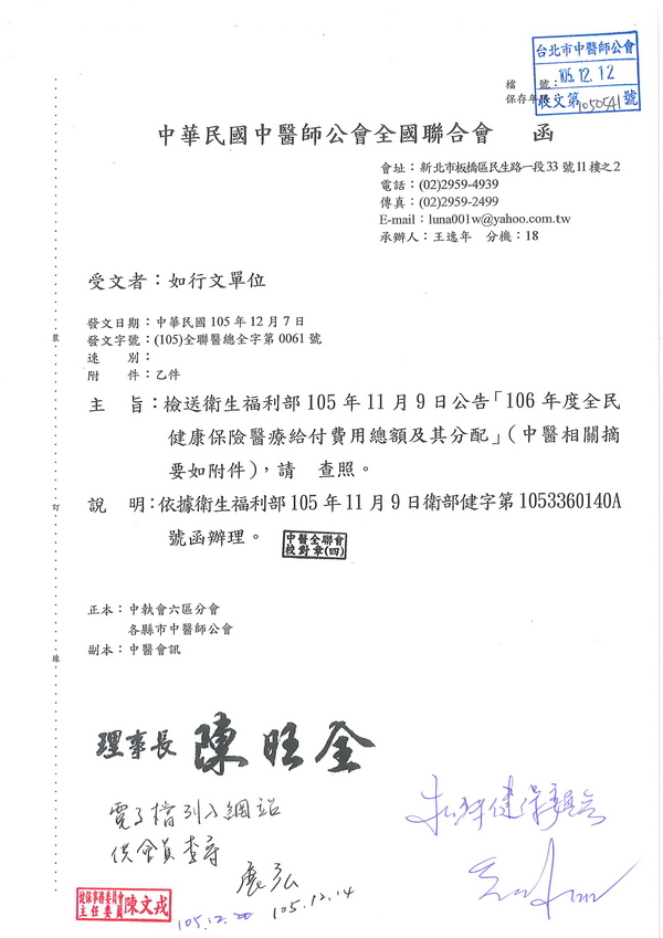 | 台北市中醫師公會 官網:http://www.tpcma.org.tw 地址:台北市中正區青島西路11號3樓 E-mail:tp.cma@msa.hinet.net 電話:(02)2314-3456(代表號) 傳真:(02)2314-8181 |