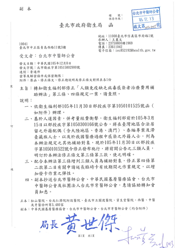 | 台北市中醫師公會 官網:http://www.tpcma.org.tw 地址:台北市中正區青島西路11號3樓 E-mail:tp.cma@msa.hinet.net 電話:(02)2314-3456(代表號) 傳真:(02)2314-8181 |