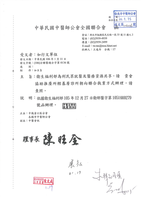 | 台北市中醫師公會 官網:http://www.tpcma.org.tw 地址:台北市中正區青島西路11號3樓 E-mail:tp.cma@msa.hinet.net 電話:(02)2314-3456(代表號) 傳真:(02)2314-8181 |