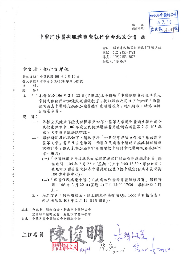 | 台北市中醫師公會 官網:http://www.tpcma.org.tw 地址:台北市中正區青島西路11號3樓 E-mail:tp.cma@msa.hinet.net 電話:(02)2314-3456(代表號) 傳真:(02)2314-8181 |