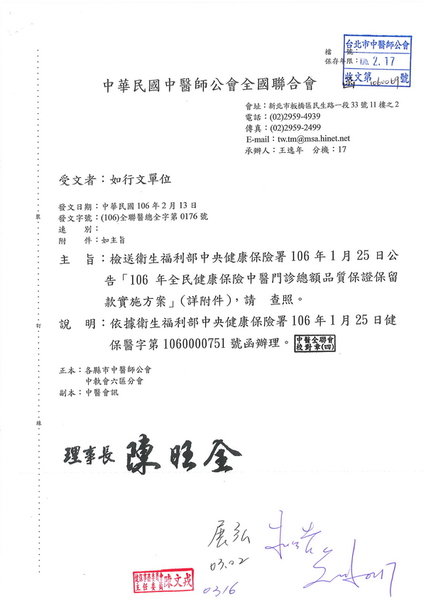 | 台北市中醫師公會 官網:http://www.tpcma.org.tw 地址:台北市中正區青島西路11號3樓 E-mail:tp.cma@msa.hinet.net 電話:(02)2314-3456(代表號) 傳真:(02)2314-8181 |