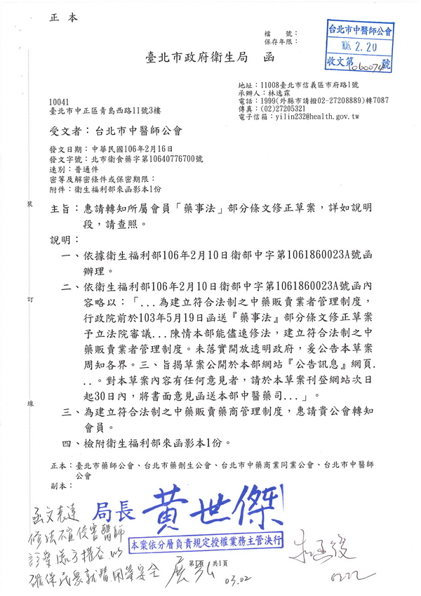 | 台北市中醫師公會 官網:http://www.tpcma.org.tw 地址:台北市中正區青島西路11號3樓 E-mail:tp.cma@msa.hinet.net 電話:(02)2314-3456(代表號) 傳真:(02)2314-8181 |