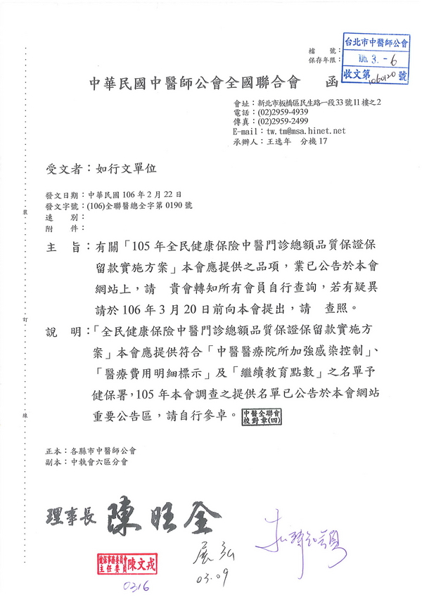 | 台北市中醫師公會 官網:http://www.tpcma.org.tw 地址:台北市中正區青島西路11號3樓 E-mail:tp.cma@msa.hinet.net 電話:(02)2314-3456(代表號) 傳真:(02)2314-8181 |