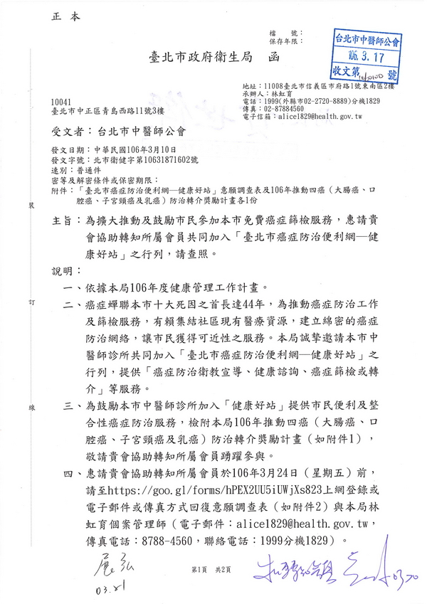| 台北市中醫師公會 官網:http://www.tpcma.org.tw 地址:台北市中正區青島西路11號3樓 E-mail:tp.cma@msa.hinet.net 電話:(02)2314-3456(代表號) 傳真:(02)2314-8181 |