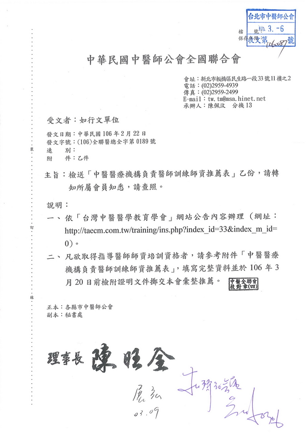 | 台北市中醫師公會 官網:http://www.tpcma.org.tw 地址:台北市中正區青島西路11號3樓 E-mail:tp.cma@msa.hinet.net 電話:(02)2314-3456(代表號) 傳真:(02)2314-8181 |