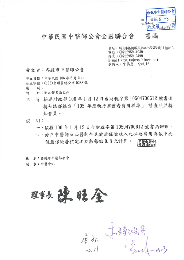| 台北市中醫師公會 官網:http://www.tpcma.org.tw 地址:台北市中正區青島西路11號3樓 E-mail:tp.cma@msa.hinet.net 電話:(02)2314-3456(代表號) 傳真:(02)2314-8181 |