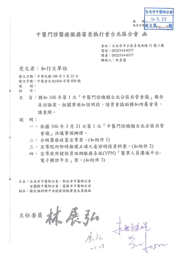 | 台北市中醫師公會 官網:http://www.tpcma.org.tw 地址:台北市中正區青島西路11號3樓 E-mail:tp.cma@msa.hinet.net 電話:(02)2314-3456(代表號) 傳真:(02)2314-8181 |