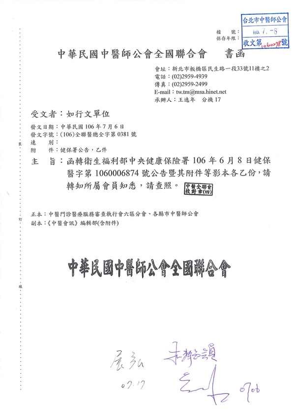 | 台北市中醫師公會 官網:http://www.tpcma.org.tw 地址:台北市中正區青島西路11號3樓 E-mail:tp.cma@msa.hinet.net 電話:(02)2314-3456(代表號) 傳真:(02)2314-8181 |