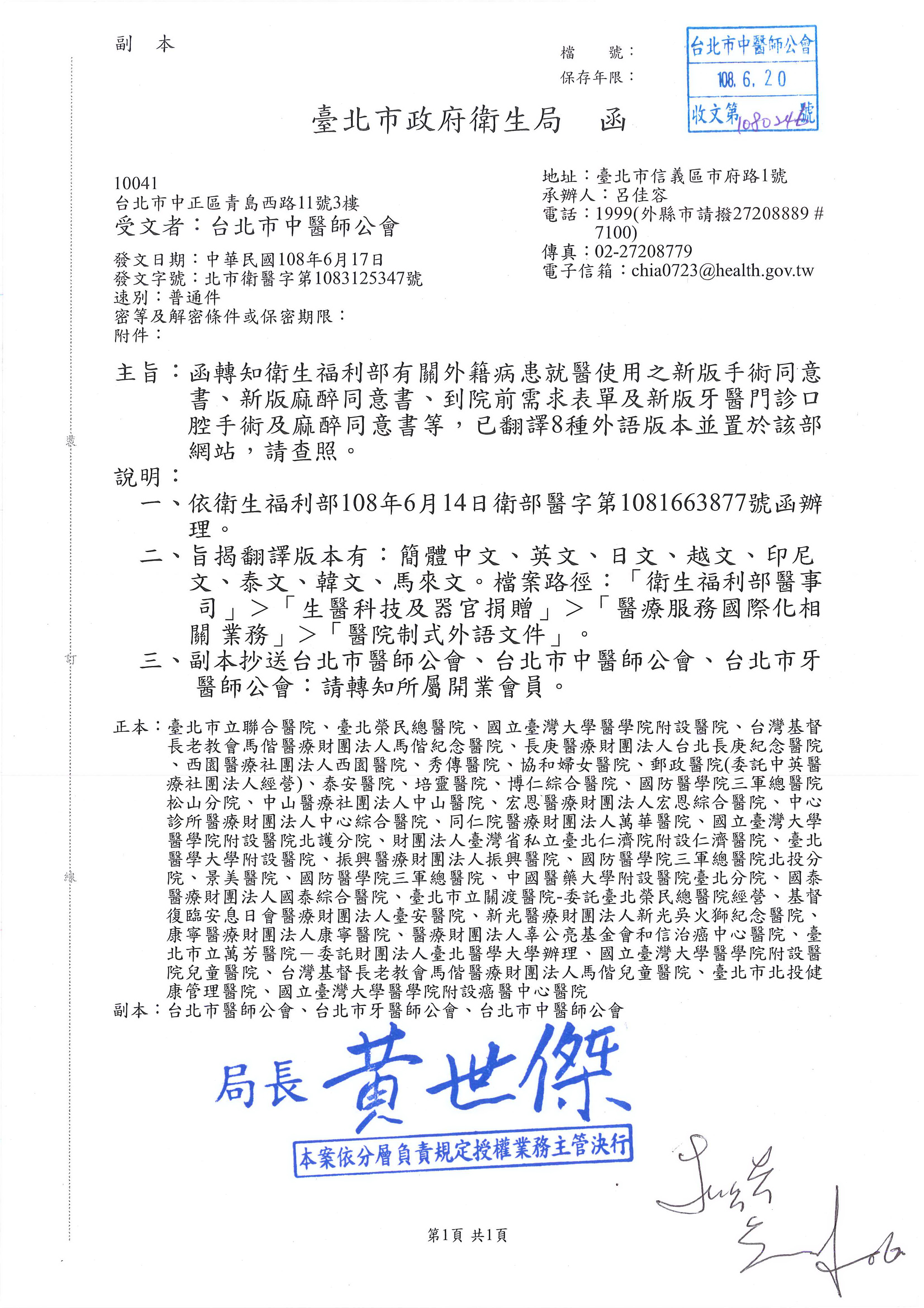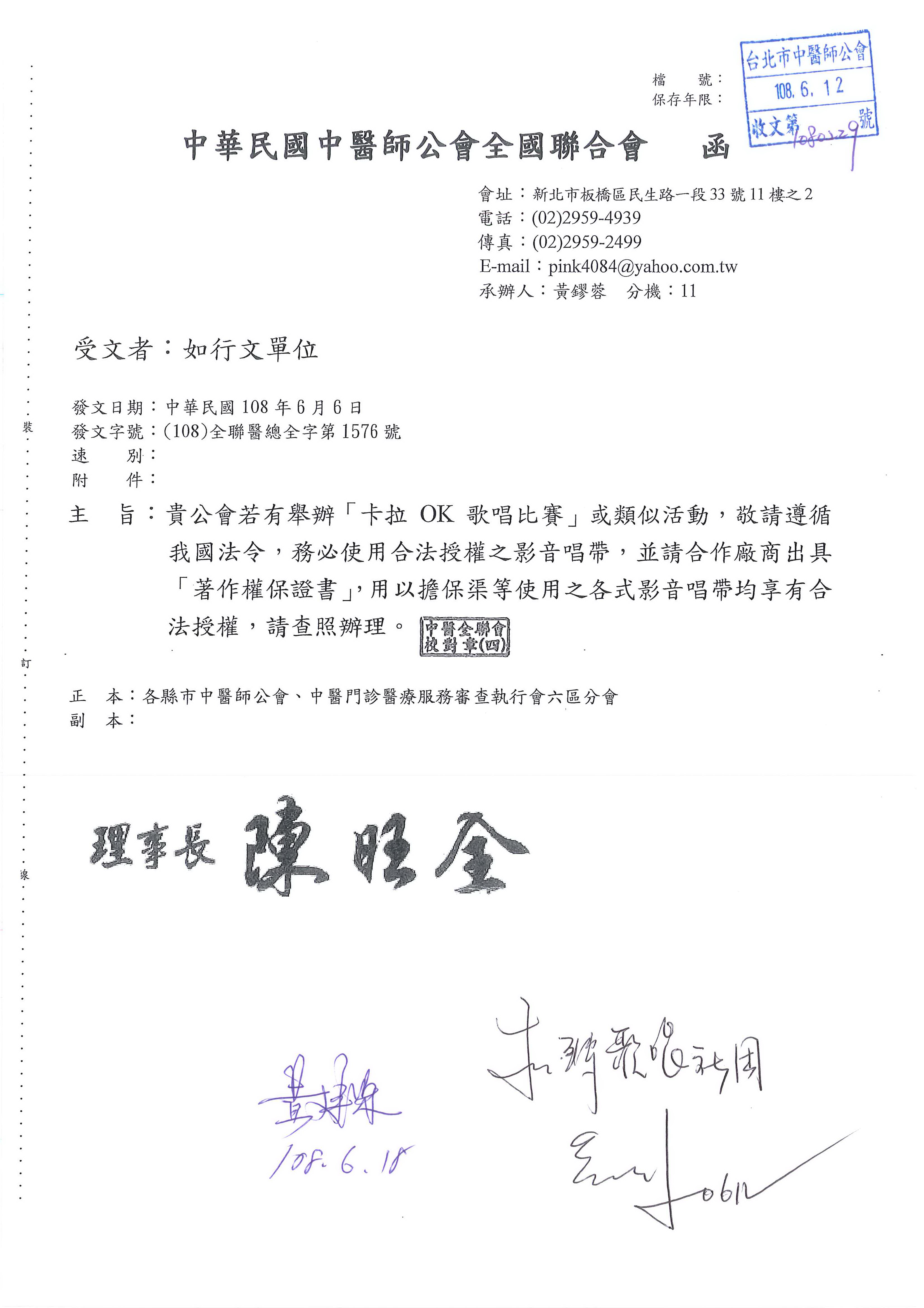 | 台北市中醫師公會 官網:http://www.tpcma.org.tw 地址:台北市中正區青島西路11號3樓 E-mail:tp.cma@msa.hinet.net 電話:(02)2314-3456(代表號) 傳真:(02)2314-8181 |