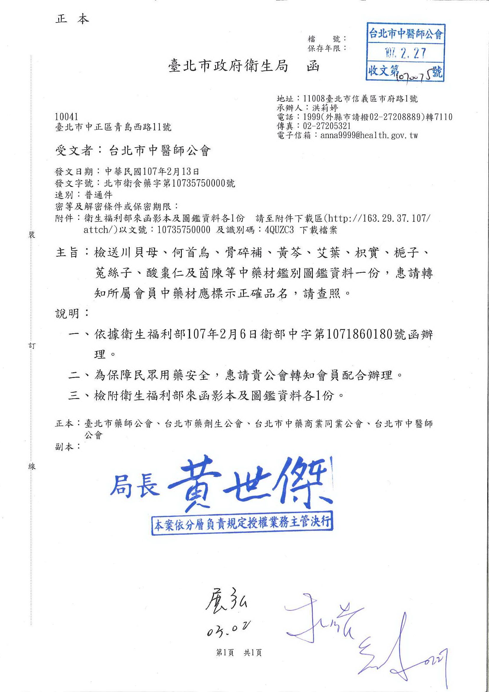 | 台北市中醫師公會 官網:http://www.tpcma.org.tw 地址:台北市中正區青島西路11號3樓 E-mail:tp.cma@msa.hinet.net 電話:(02)2314-3456(代表號) 傳真:(02)2314-8181 |